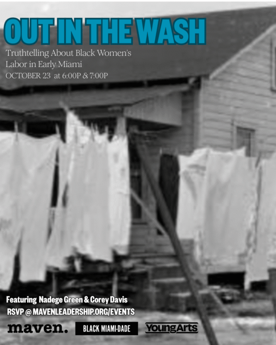 Out in the Wash is presented by Maven Leadership Collective, Black Miami-Dade, and YoungArts as public programming for YoungArts Artist-in-Residence Nadege Green’s latest exhibit, The Power of Her Hands: Black Washerwomen in Early Miami. The exhibit opens to the public on December 1, 2025 in the YoungArts gallery.