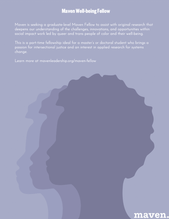 We are seeking a graduate-level Maven Fellow to assist with original research that deepens our understanding of the challenges, innovations, and opportunities within social impact work led by queer and trans people of color and their allies. This is a part-time fellowship ideal for a master’s or doctoral student who brings a passion for intersectional justice and an interest in applied research for systems change. This fellow will be paid $25/hour.